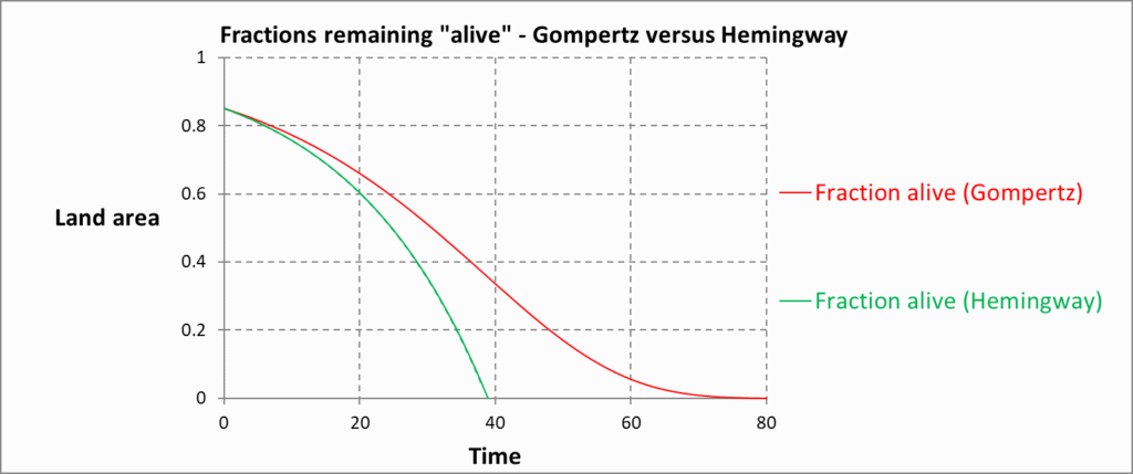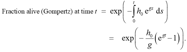 Notice that this involves an “exponential of an exponential” – a so-called tower of exponentials (e-e) – and hence the initially accelerating rate of decline in the fraction alive. In the early years, this is similar to the accelerating rate of decline in the fraction alive in the simpler Hemingway formula: